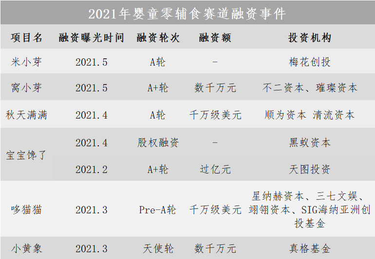 2021年春節(jié)過后的三個月的時間內(nèi),這個賽道至少已經(jīng)發(fā)生了7起融資事件,真格、順為、梅花、天圖、黑蟻、清流等知名機構(gòu)不斷押注,這個賽道就是嬰童零輔食。