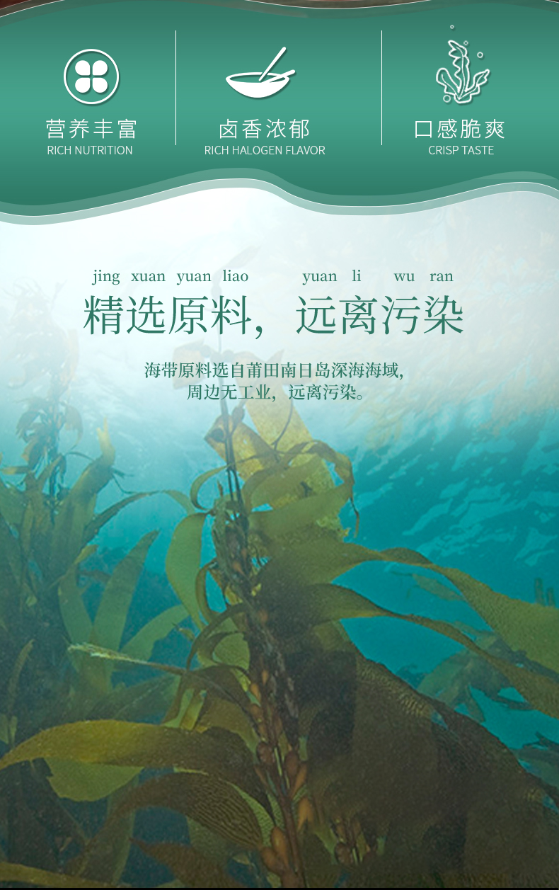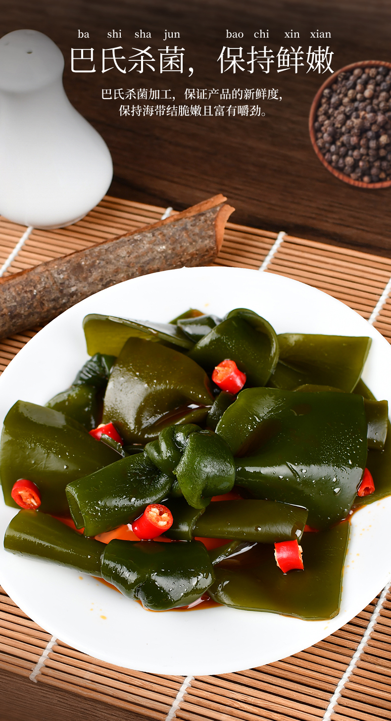 鹽漬海帶(海帶,食用鹽,脫氫乙酸鈉)(≥80%),水,大豆油,食用香精香料,食用鹽,味精,辣椒,黃酒,香辛料,5’-呈味核苷酸二鈉,檸檬酸,冰乙酸,乳酸,D-異抗壞血酸鈉,安賽蜜,山梨酸鉀。