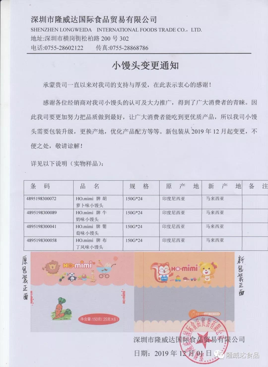 關(guān)于本公司HO.mimi牌150g小饅頭的變更通知